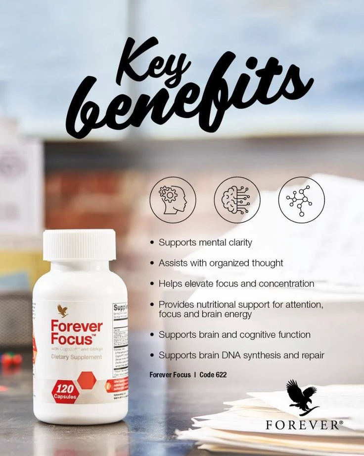 Le *Forever Focus* est un complément alimentaire de *Forever Living* conçu pour soutenir les fonctions cognitives et améliorer la concentration mentale. Il est particulièrement bénéfique pour les étudiants, les professionnels, les sportifs et les seniors actIfs